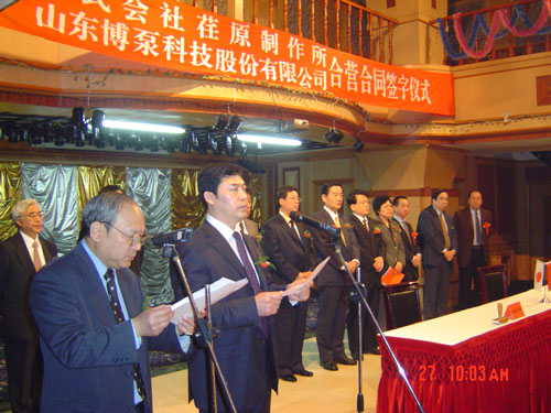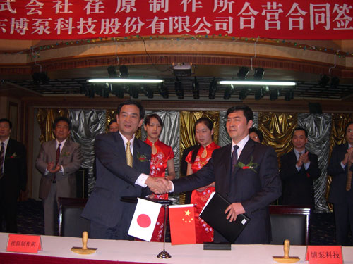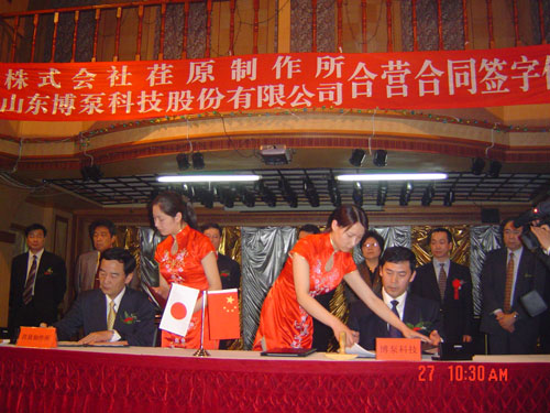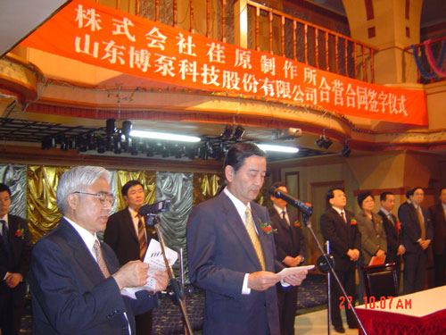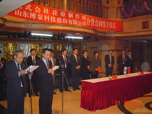 新聞中心 2005年4月27日,在博山萬(wàn)杰?chē)?guó)際大酒店山東博泵科技股份有限公司與日本株式會(huì)社荏原制作所正式簽署了注冊(cè)資本1100萬(wàn)美元的合營(yíng)公司――荏原博泵有限責(zé)任公司。該公司的建立將通過(guò)引進(jìn)世界最大的泵企業(yè)――日本株式會(huì)社荏原制作所的先進(jìn)技術(shù),加快大型泵、高壓泵國(guó)產(chǎn)化進(jìn)程,建成具有國(guó)際競(jìng)爭(zhēng)力的一流企業(yè)。為中國(guó)水電、核電及超臨界火電項(xiàng)目,為南水北調(diào)等大型水力工程提供高質(zhì)量、高技術(shù)含量的一流泵產(chǎn)品,提升中國(guó)機(jī)械工業(yè)技術(shù)、質(zhì)量水平,促進(jìn)產(chǎn)品更新?lián)Q代,為中國(guó)電力、冶金、水力事業(yè)的發(fā)展乃至中國(guó)國(guó)民經(jīng)濟(jì)的發(fā)展做出應(yīng)有的貢獻(xiàn)。