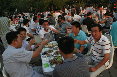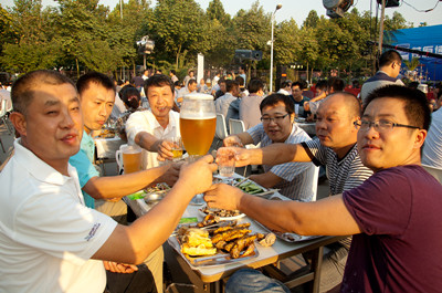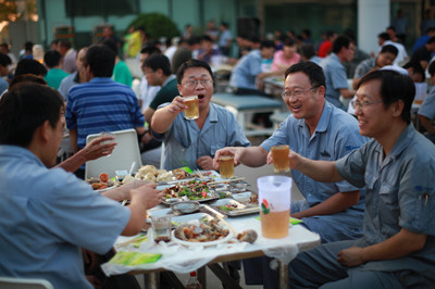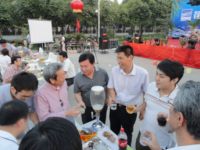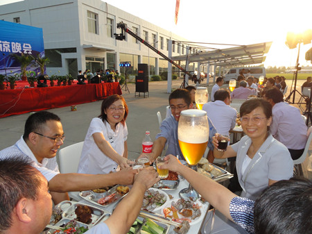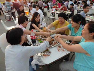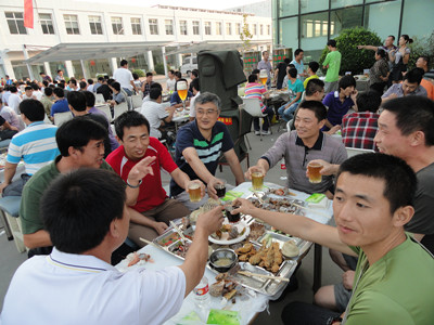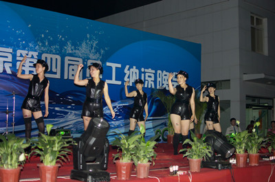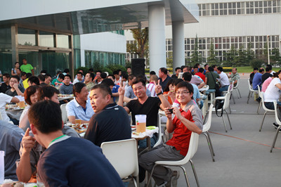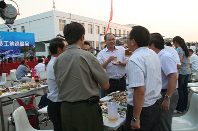 17:30分, “第四屆員工納涼晚會”正式開始。首先是員工聚餐。近400名員工,伴著歡快的樂曲聲,推杯換盞,大快朵頤。公司總經(jīng)理志賀進、常務副總經(jīng)理王正軍等公司領導走入員工中,與員工們親切交談,敬酒祝愿,整個會場洋溢著一張張歡樂的笑臉。