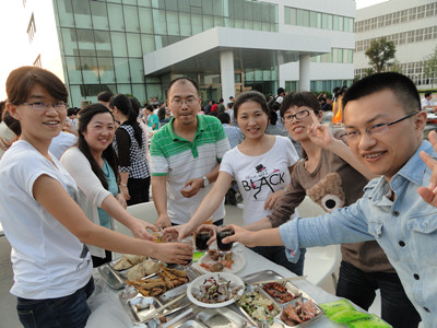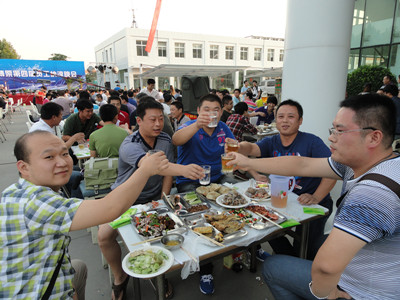 24日下午,公司辦公樓前,擺放著一排排桌椅,員工們從餐廳端著盛滿豐盛食物的餐盤,擺放在餐桌上。南面的舞臺上,工作人員在緊張的調試音響,兩只紅色的氫氣球飄揚在空中,在蔚藍的天空映襯下,格外的鮮艷,為整個會場增添了喜慶的氣氛。